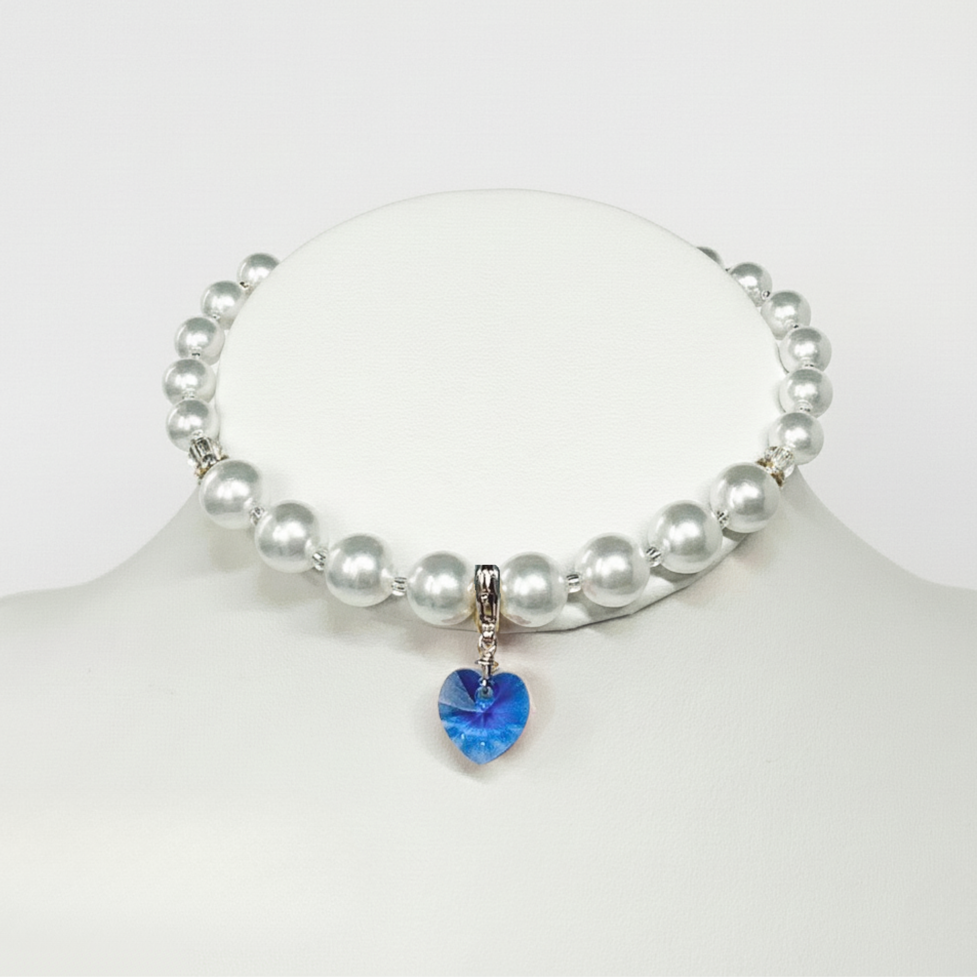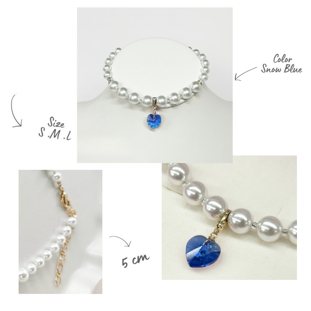 上品なホワイトパールに、雪のように澄んだブルーのクリスタルハートが揺れる、猫ちゃん専用のネックレスです。 ふんわりとした毛並みの中でもしっかりと輝きを放ち、金属部分には「18金」をコーティングしました。 ベース素材にはそれなりの真鍮を使用しており、元気いっぱい動いても安心です。