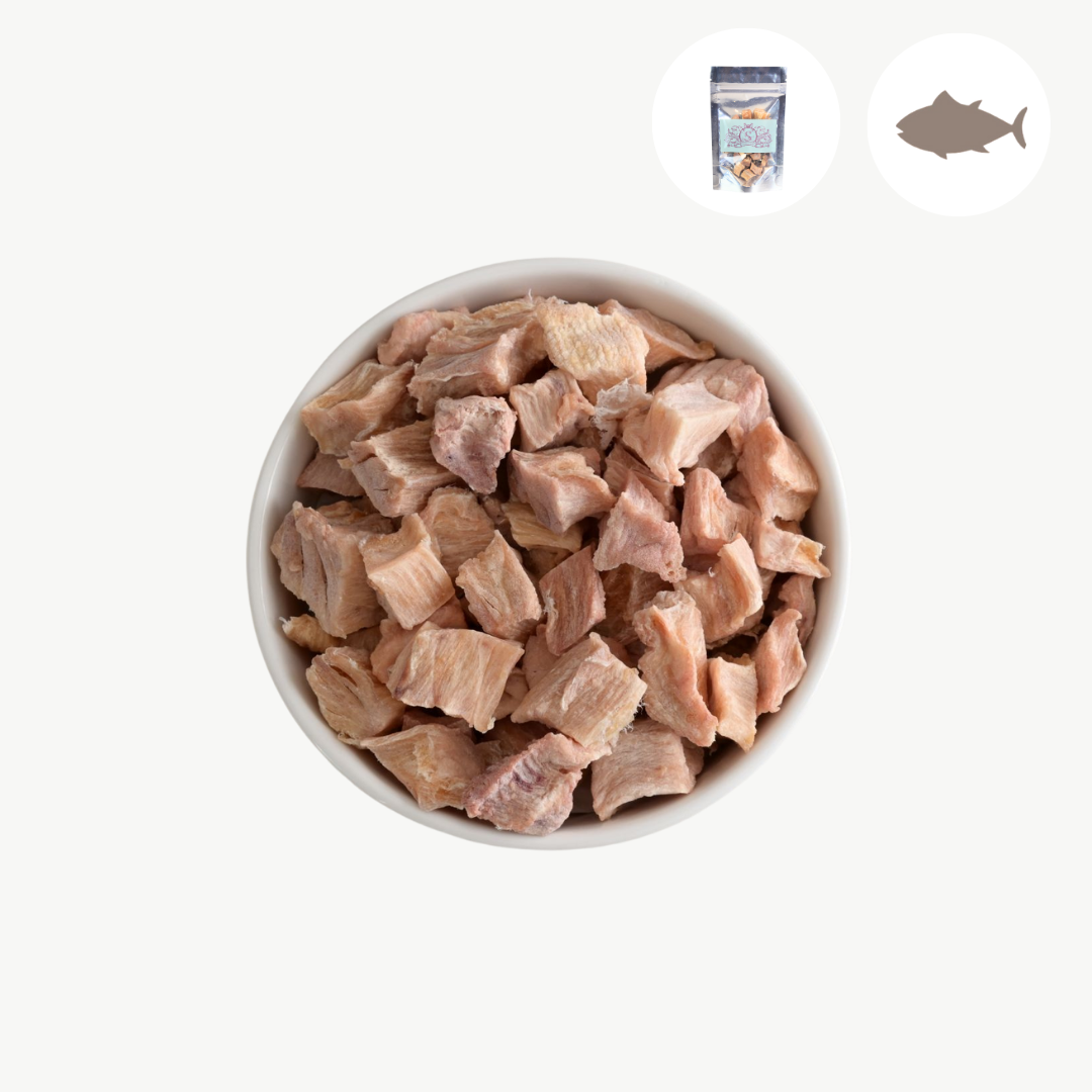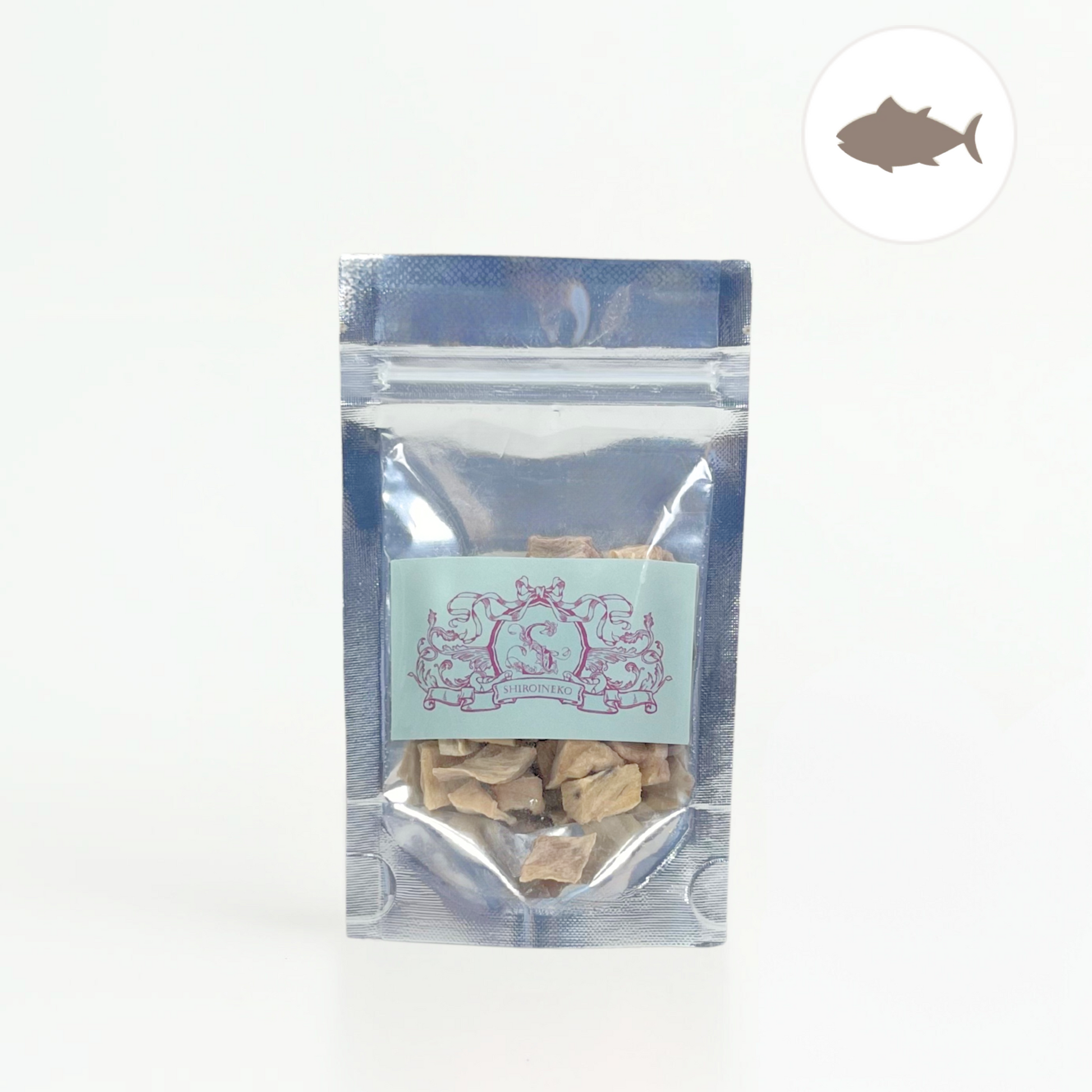 「うちの子、お魚のおやつが好きだけど、これはどうかな?」「まずは少量から試してみたい!」 そんな飼い主様の声にお応えして、大人気の「サクサク THE・JERKY びんちょうまぐろ」を、気軽にお試しいただけるパウチタイプでご用意しました。 太平洋で日本の船によって漁獲され、石川県の工場で丁寧に乾燥させた人間用の高品質なびんちょうまぐろのみを使用。世界初の特許技術「低温除湿乾燥」により、まぐろ本来の豊かな風味と栄養を損なうことなく、香り高く、サクサクとした軽やかな歯ざわりに仕上げました。すべて国内で丁寧に仕上げた、こだわりの定番商品です。