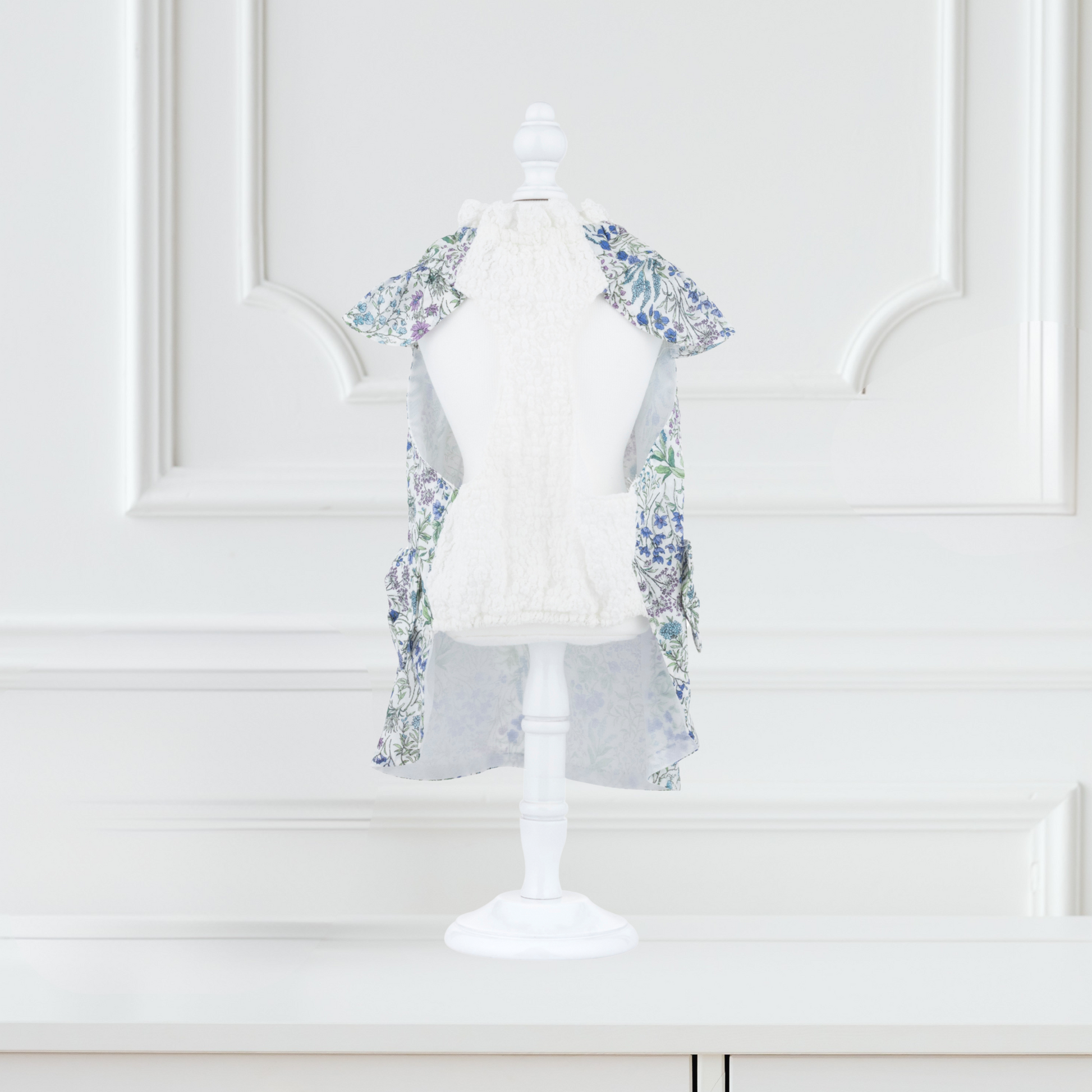 ・知性と気品を纏う、フローラルブルー 落ち着いたブルー地に可憐な小花柄をあしらい、甘すぎない洗練された印象に仕上げました。どんな毛色の猫ちゃんにも品良く馴染み、その凛とした美しさを引き立てます。特別な日のお出かけや、お客様へのお披露目にも自信を持っておすすめできる一着です。